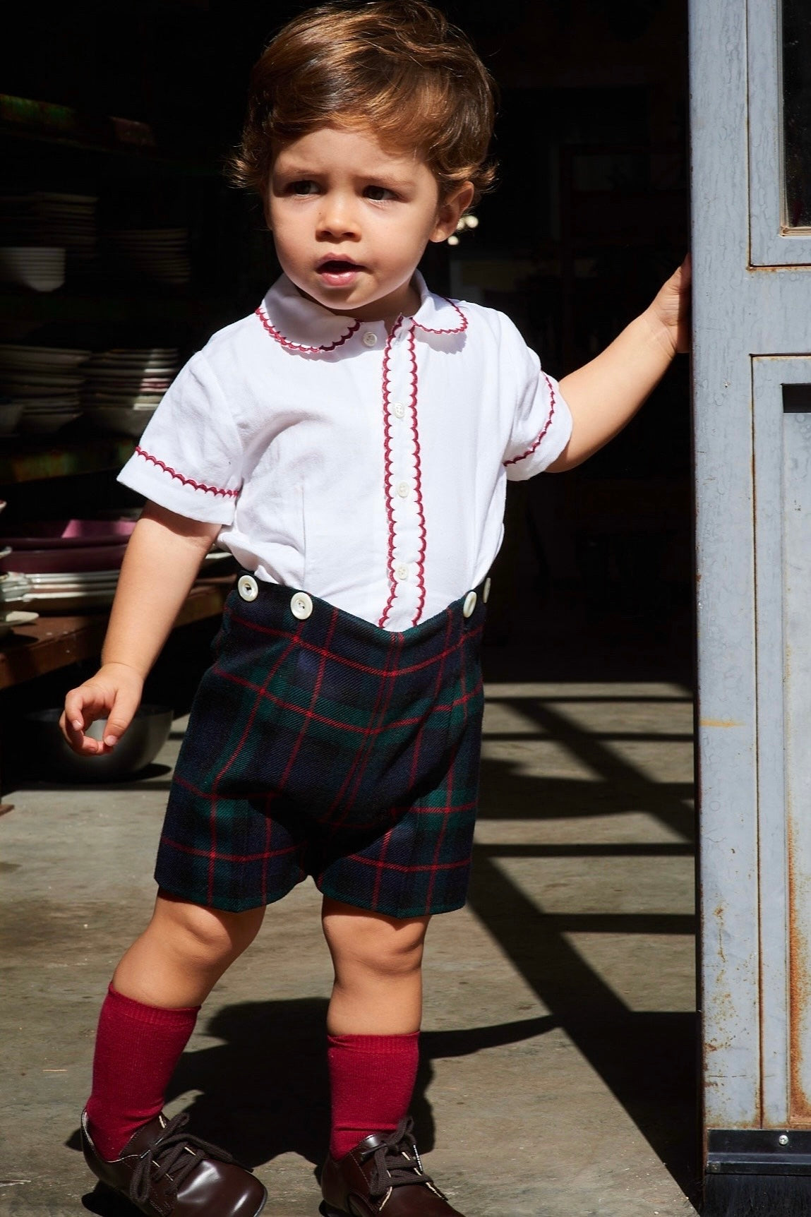 Descripción artículo: Conjunto de bebé compuesto por camisa con festones y pantalón abotonado de tartán escocés. Elaborado de manera artesanal en España.