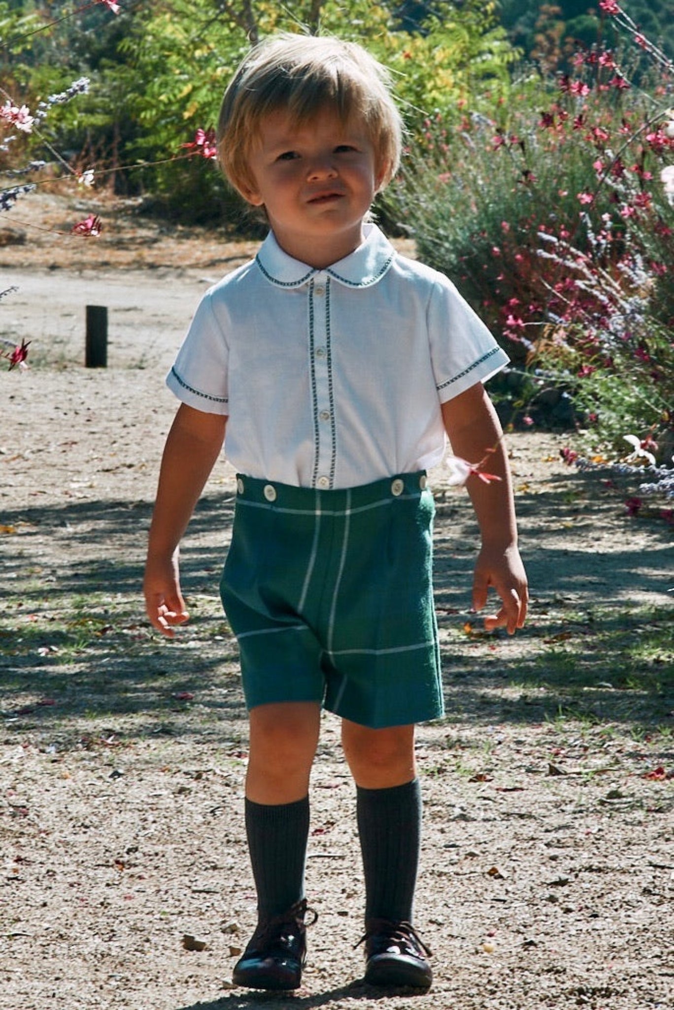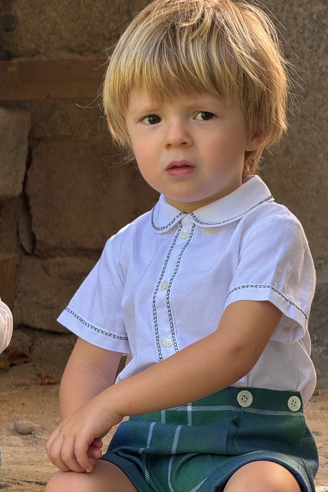 Descripción artículo: Conjunto de bebé compuesto por camisa de viyella con crucecita bordada y pantalón abotonado de tartán escocés. Elaborado de manera artesanal en España.