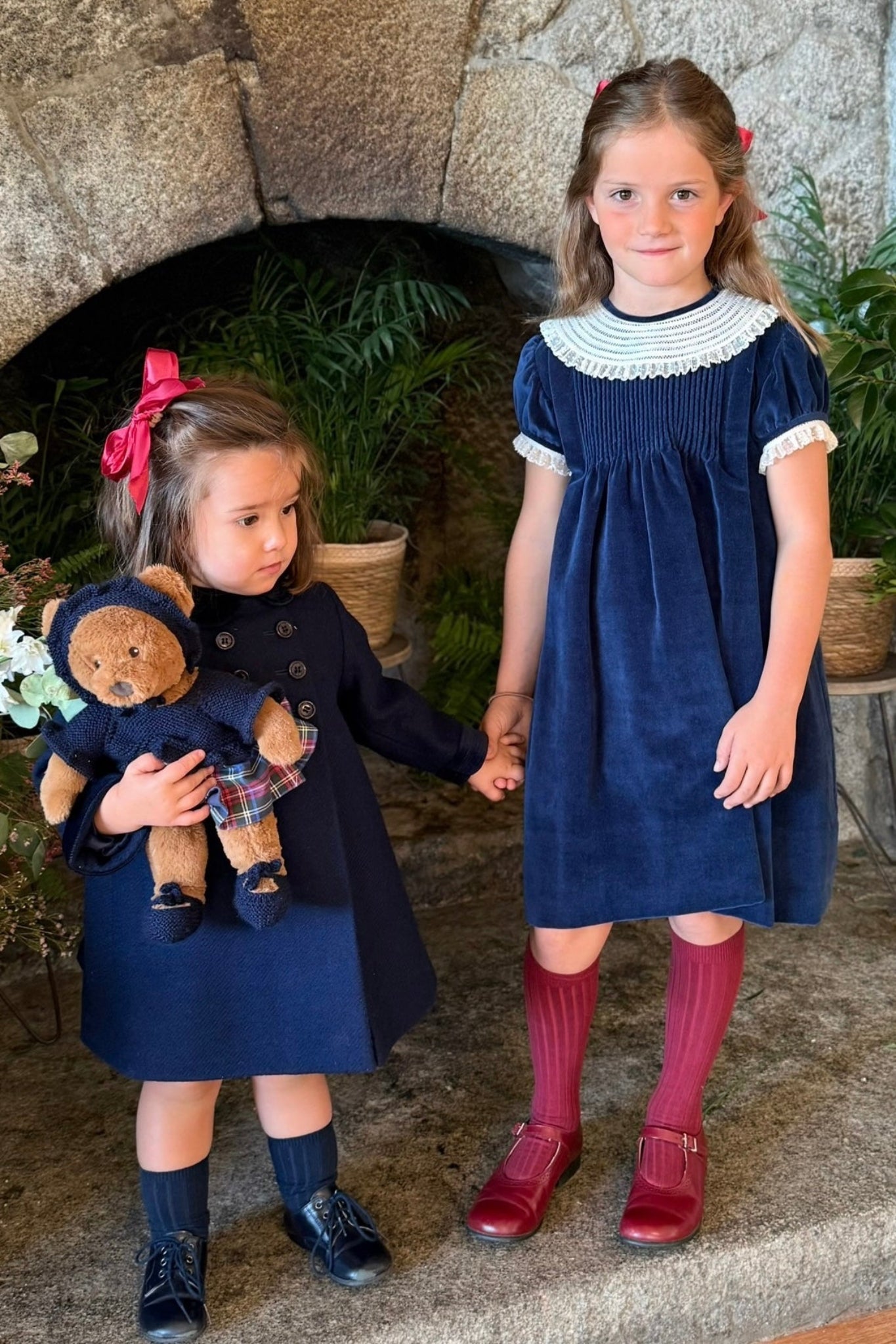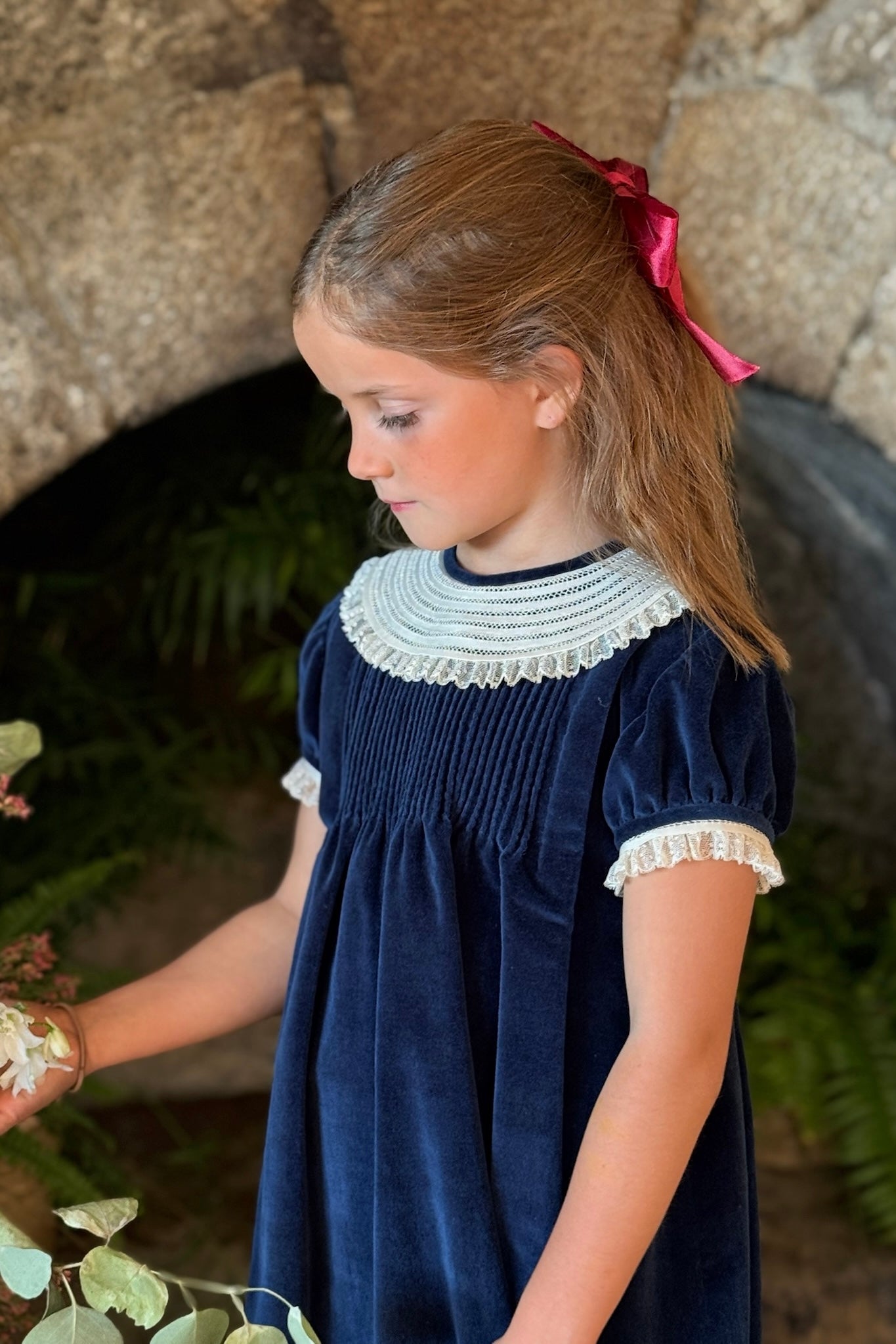 Descripción artículo: Vestido de terciopelo con jaretitas en el pecho y cuello bordado con punto París y puntilla Valencienne.