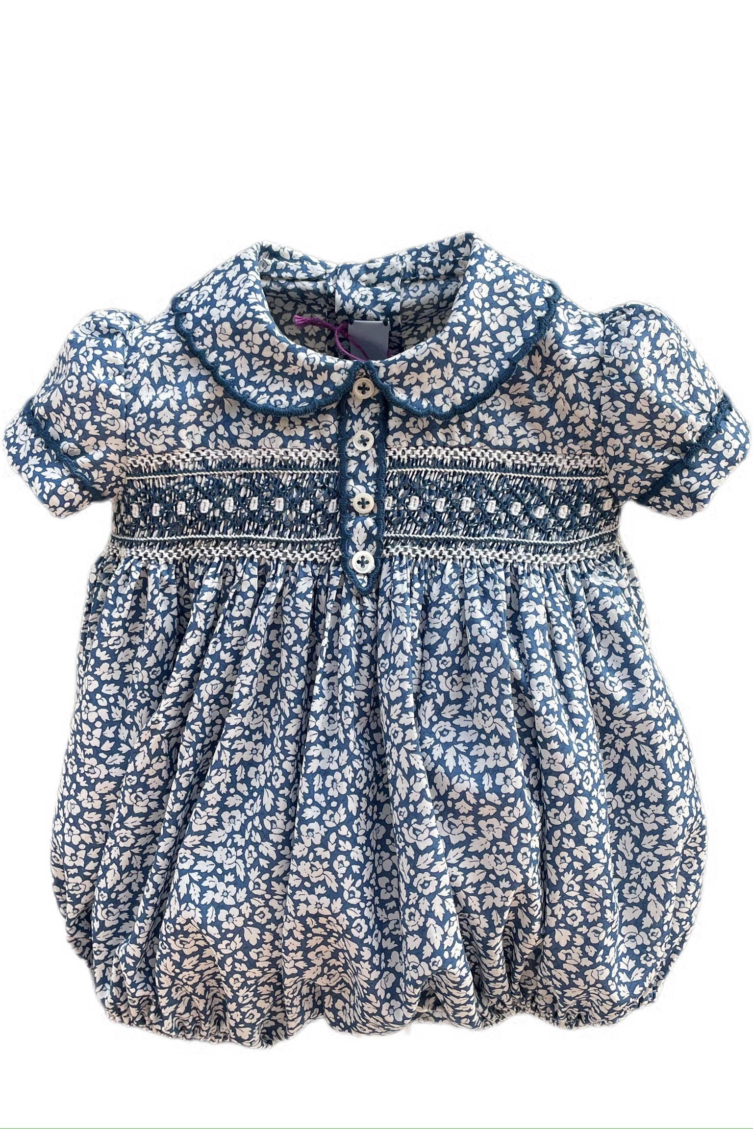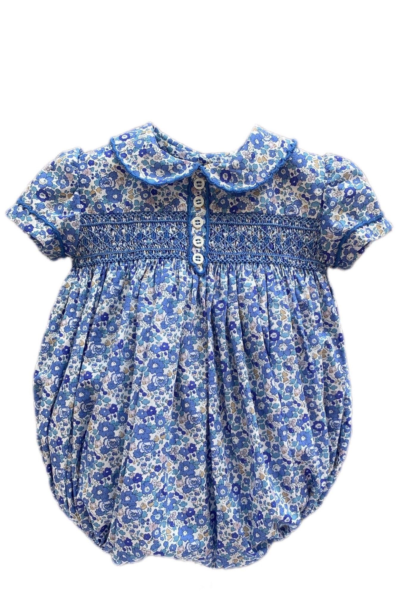 Descripción artículo: Ranita de Liberty con punto smock y festones bordados a mano en puños, cuello y tapilla. Elaborado de manera artesanal en España.